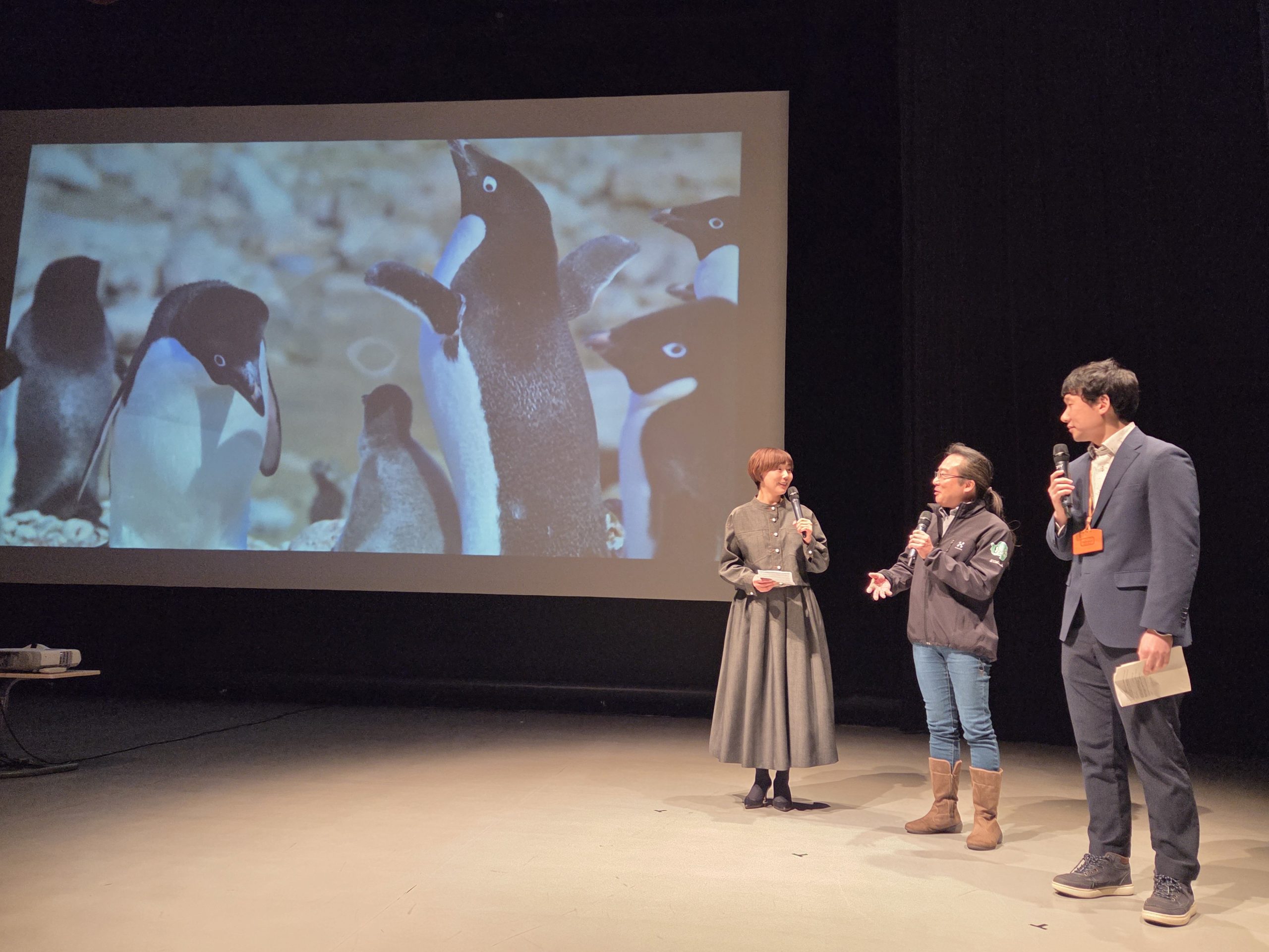 KDDIでは毎年社員1名が南極地域観測隊の一員として、観測や研究に欠かせない通信を守る大切な任務に当たっています。上映の前に北海道出身で第54次日本南極地域観測隊の大越崇文さんが南極での生活やペンギンの様子について貴重なお話をしてくださいました。